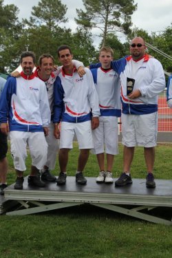 L’équipe arc à poulies Bruno MORTEMOUSQUE - Julien GIL - Clément MORTEMOUSQUE- Francis DAVID grimpe sur la 3 ème marche du podium après avoir disputé âprement les matchs de duels dans le vent.